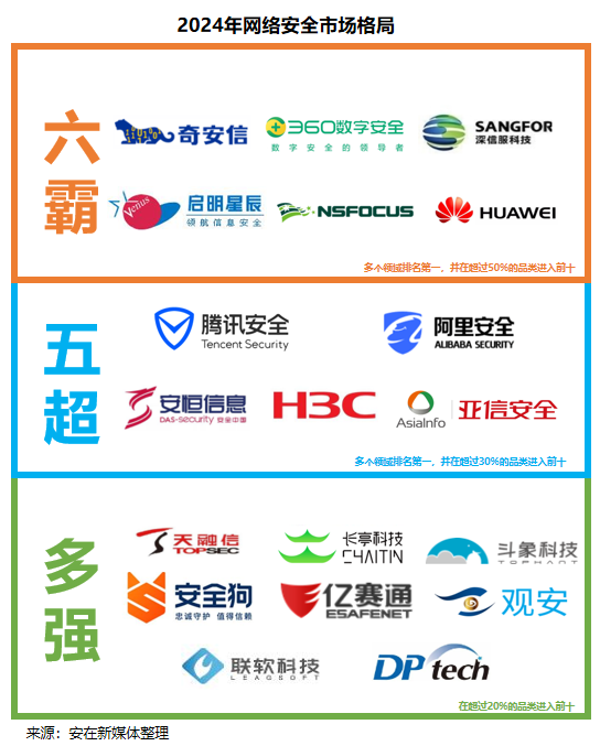“六霸”是指奇安信、360数字安全、深信服、启明星⾠、绿盟科技、华为,“五超”是指阿⾥安全、腾讯安全、安恒信息、新华三、亚信安全,“多强”是指包括天融信、⻓亭科技、⽃象科技、安全狗、亿赛通、观安信息、联软科技、迪普。