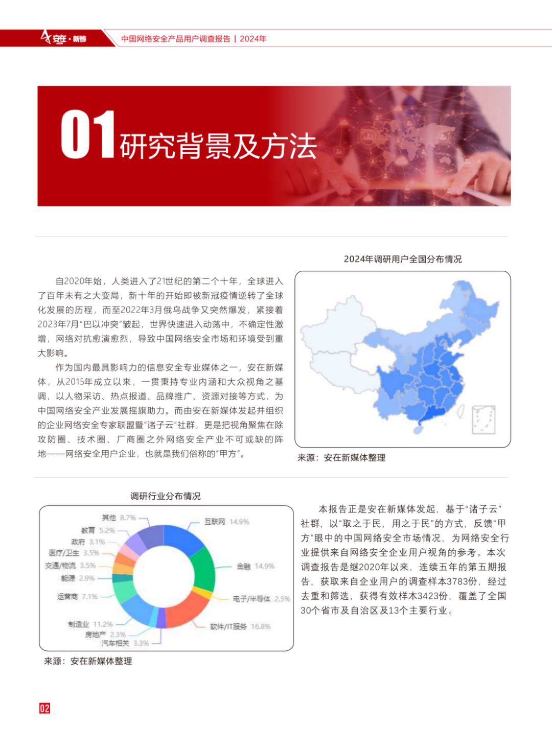 安在新榜发布2024年度《2024中国网络安全产品用户调查报告》,这是安在新媒体继2020年以来,连续5年发布的第五期报告,通过对全国企业用户进行专项调查,获得了来自甲方企业反馈的有效样本3423份,覆盖了全国30个省市及⾃治区及13个主要⾏业。结合多年积累的历史数据,进行对比研究分析得出。本次报告深入分析了当前网络安全领域的发展状况和主要挑战。反馈甲方企业眼中的中国网络安全市场情况,为网络安全⾏业提供来⾃企业用户视⻆的数据参考。