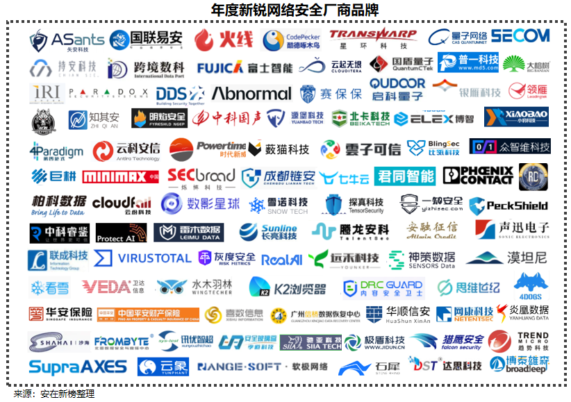 为增加企业用户的选择面,同时展示更多网络安全新生力量,报告基于2023-2024年“大众点评”全景图,统计了近2年来新上榜的、同时未被纳入“百强榜”的网络安全厂商品牌95家,他们在各自擅长的产品领域中,皆得到了企业用户的认可,报告将其作为“年度新锐网络安全厂商品牌”进行展示。