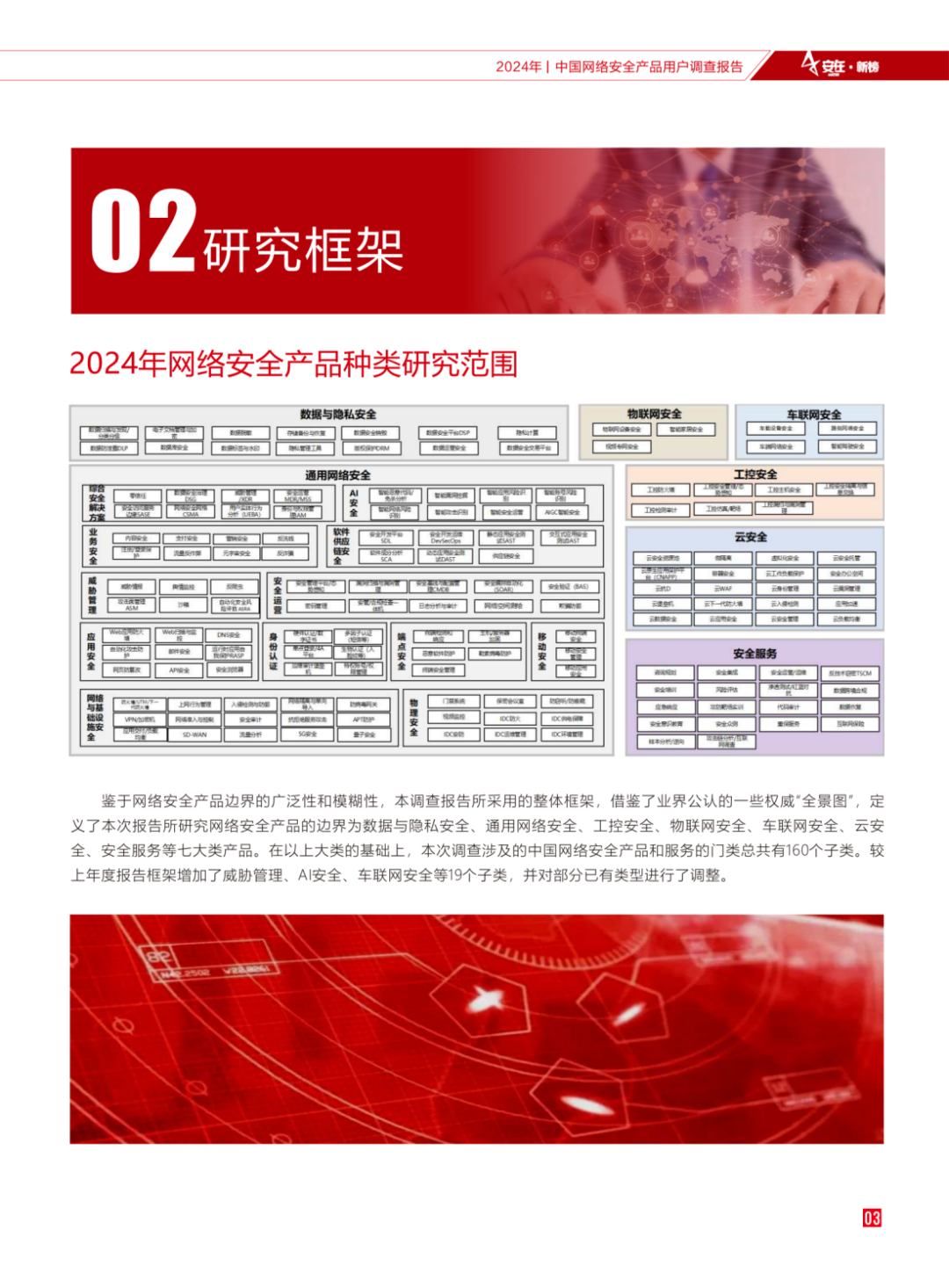 本次报告所研究的网络安全产品框架覆盖了7个领域,分别是数据与隐私安全、通⽤网络安全、⼯控安全、物联网安全、车联网安全、云安全、安全服务。共涉及160个⼦类的安全产品。较上年度报告框架增加了威胁管理、AI安全、车联网安全等19个子类。