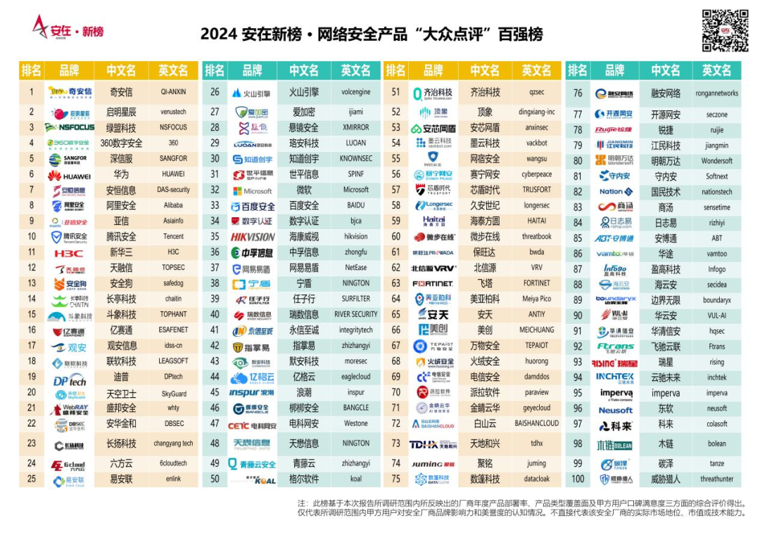 同时,基于全景图中网安厂商品牌的表现,报告进一步发布了《2024安在新榜网络安全产品“大众点评”百强榜》。