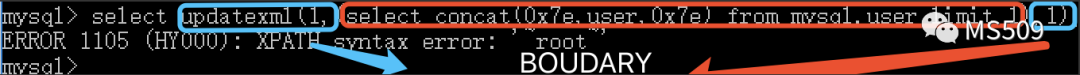 SQL注入根据分类方法不同可分为不同的类型,从SQL注入漏洞利用角度来说,一般有五种注入利用方法,分别是报错注入、联合查询注入、布尔盲注、延时注入、堆查询注入。无论那种注入方式,利用payload都可以分为两部分构成,对应的利用语句(BOUNDARY)和基本查询(QUERY)比如报错注入语句:【updatexml(1,(select concat(0x7e,user,0x7e) from mysql.user limit 1),1)】蓝色圈起来的报错语句就是BOUNDARY,红色圈起来的部分就是QUERY,也是我们需要绕过的主要目标。