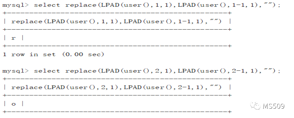 |replace(LPAD(user(),2,1),LPAD(user(),2-1,1),””);|