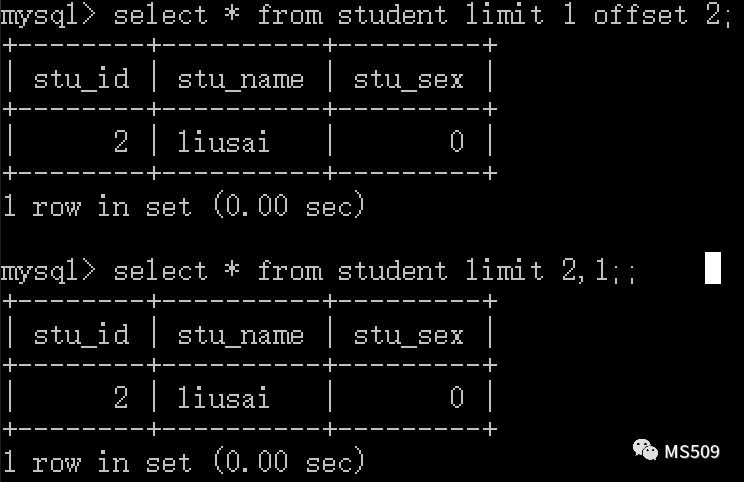 limit 2,1 <=>limit 1 offset 2