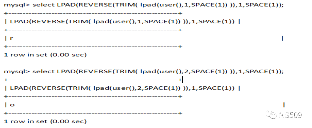 |LPAD(REVERSE(TRIM( lpad(user(),1,SPACE(1)) )),1,SPACE(1);|