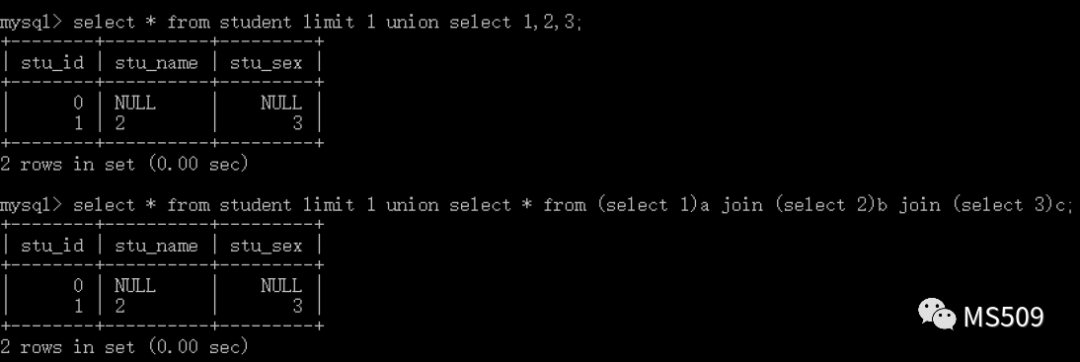 union select * from (select 1)a join (select 2)b join (select 3)c