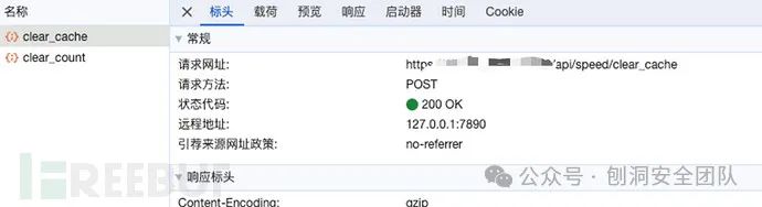 漏洞就出在这个地方,注意了,在刚刚点击 "清除所有缓存" 时,看到浏览器发了两个包出去,如图: