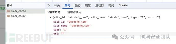 第一个包请求了一个叫 "clear_cache" 的 API,其中包含了一个叫 "site_id" 的参数,如图: