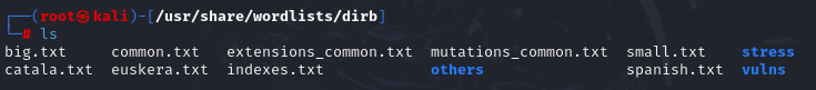 big.txt #大的字典 small.txt #小的字典 catala.txt #项目配置字典 common.txt #公共字典 euskera.txt #数据目录字典 extensions_common.txt #常用文件扩展名字典 indexes.txt #首页字典 mutations_common.txt #备份扩展名 spanish.txt #方法名或库目录 others #扩展目录,默认用户名等 stress #压力测试 vulns #漏洞测试
