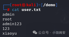 先创建一个密码字典,手动编写密码(测试即可,真实渗透环境自行使用大型字典)