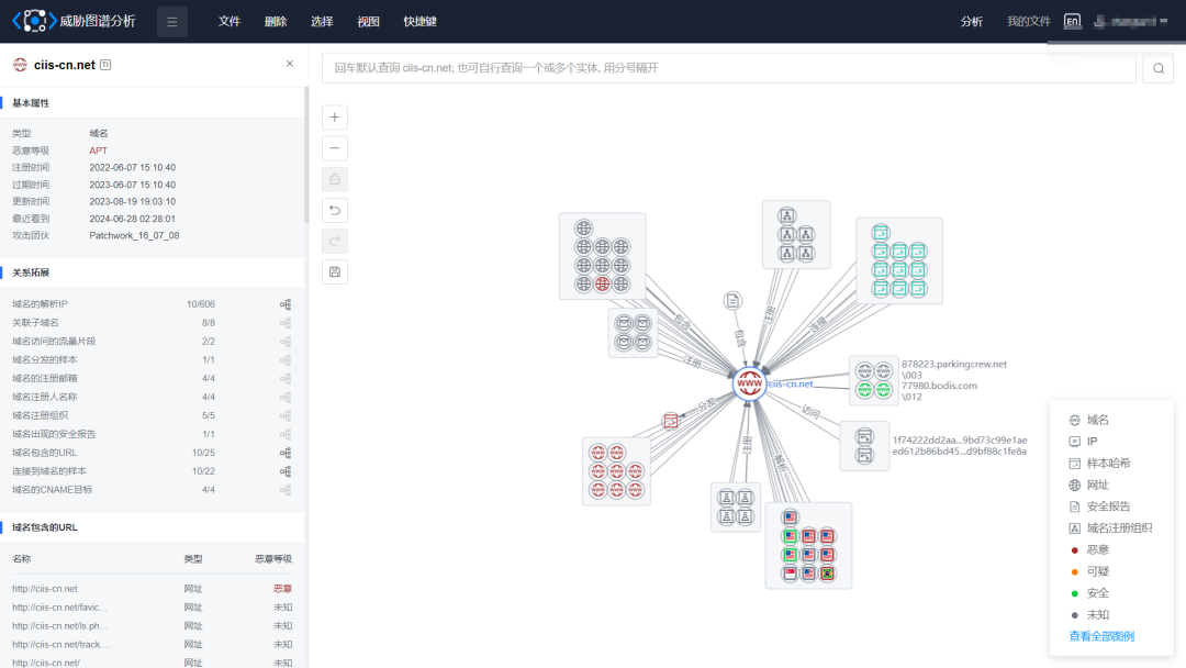 **威胁图谱分析:**平台支持多类型数据实体的单个或批量查询,基于威胁发现能力模型展示数据实体间的关联关系,提供多方位下钻查询、拓线溯源能力,具备更高效的数据挖掘和整合能力,帮助分析人员更精准地判别威胁、更全面地掌握攻击者信息。