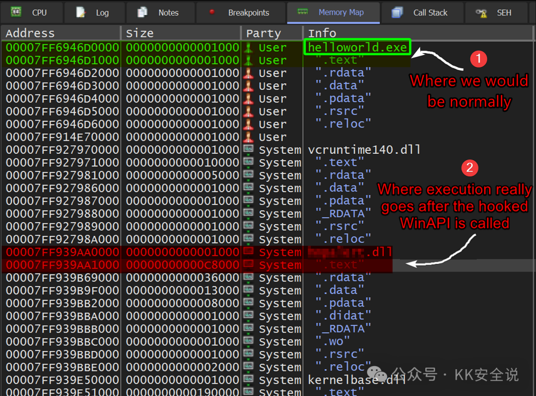 调试器显示 Hello World 进程中已加载的“模块”。我们可以看到 kernelbase.dll、ntdll.dll 和其他预期的 DLL。但红色的 DLL 属于 EDR。DLL 名称已模糊处理,以避免与供应商产生法律问题。