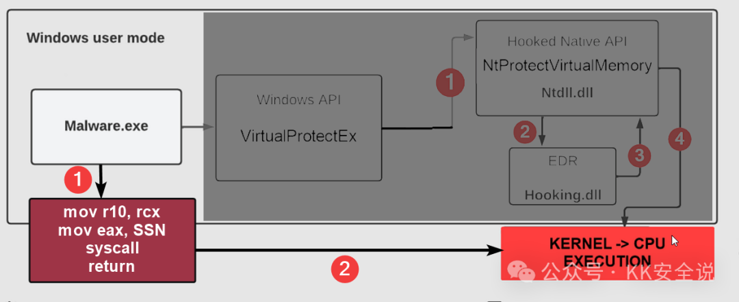 即使我们手动调用与已挂钩的 Windows API(如 VirtualProtect)相对应的 Native API,挂钩仍会抓住我们。因此,大多数 EDR 挂钩规避技术的起点是手动实现所需“系统调用”(Native API 函数)的汇编代码并直接调用它们。