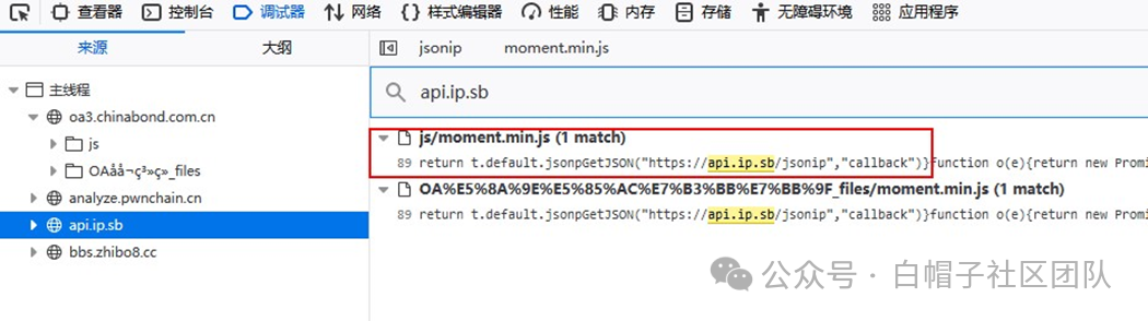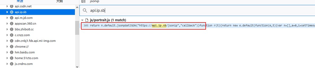 猜测了就要进行验证,这里在控制台抓到了一个请求的api–api.ip.sb,抓取后全局进行搜索: