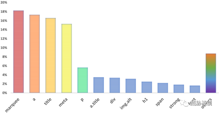 44 个常见的插入标签中,marquee、a、title、meta是攻击者最喜欢的,合计占到 67%。