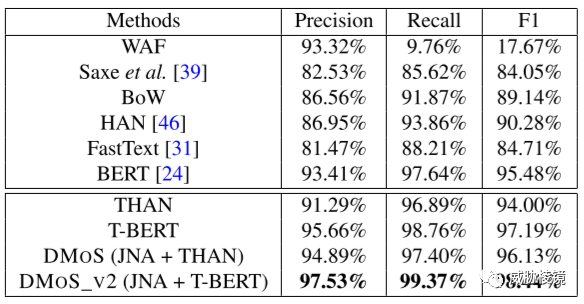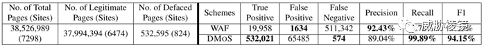 DMoS 系统由 12500 行 Python 代码实现,评估与 WAF和前人的一些工作进行比较,结果如下所示: