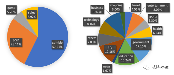 被植入暗链的网站主要是政府网站(39%)和新闻网站(15%)。推广的绝大部分是赌博(61%)和色情(27%),游戏(9%)和其他类型物品的销售(3%)较少。