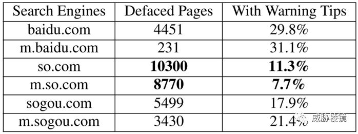 通过中文三大搜索引擎进行结果对比,360 的检索结果令人担忧,包含数量最多且告警提示比例最低。