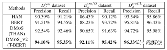 与普通的 HAN 相比,THAN 是有提升的。与普通的 BERT 相比,TBERT 也是有提升的。但是,想在实际生产环境中应用 BERT 及其变种并不现实,模型参数太多且速度堪忧。TBERT 需要 1.08 亿个参数,而 THAN 只需要 160 万个参数。测试时,每个网页 THAN 需要 0.28 秒进行处理,而 TBERT 需要 9.87 秒。DMoS(JNA+THAN)已经超过了所有其他方案的表现。