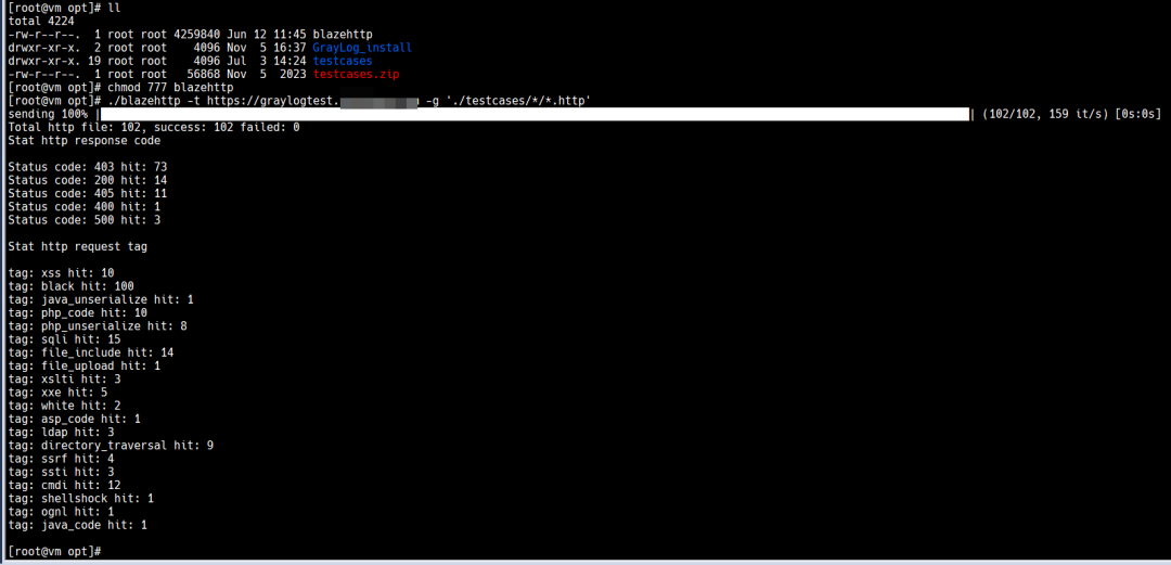 ./blazehttp -t https://WAF站点地址 -g './testcases/*/*.http'
