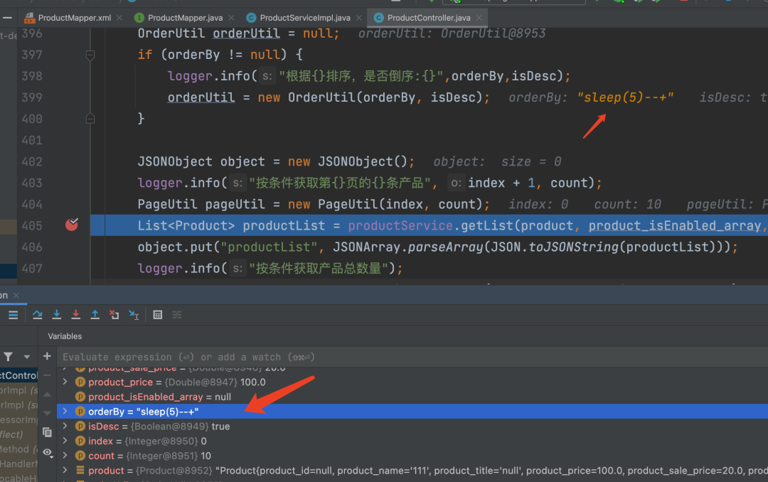 然后orderutil默认null,判断orderby是否为空,不为空则执行打印,然后吧数据带入到orderutil,再然后带入断点的地方: