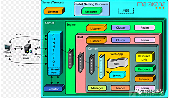 其实在注入内存马的过程中我们获取的StandardContext,WebApplicationContext也都是只能作用于当前的context,其实在攻击过程中也完全可以注入到其他的context中,让防守方更难排查,从而进行维权。下面放一张tomcat的架构图,从而让有些不是很了解tomcat的师傅了解一下context的意义。同时这张图也跟下面的代码息息相关。