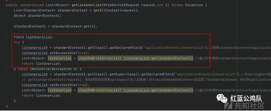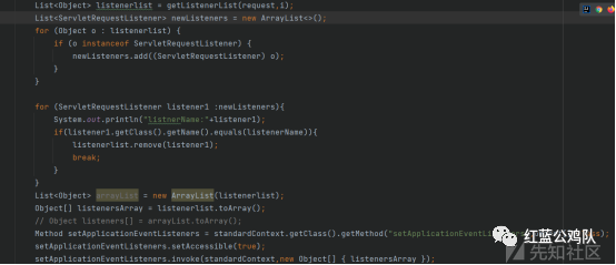 这个setApplicationEventListeners非常的有趣,他将原先的applicationEventListenersList先全部清空,然后再把传入的listeners对象组成的数组传入。applicationEventListenersList是从web.xml中获取的,也就是代码中原本注册的,攻击者如果注入Listener内存马,该内存马也会被保存到applicationEventListenersList之中。这里就会导致一个问题,如果我们反射调用setApplicationEventListeners,他会先清空原先所有的listener,然后我们只需先反射获取standardcontext的applicationEventListenersList字段,然后将攻击者的内存马名字取出来,在数组中进行删除,再反射调用setApplicationEventListeners即可删除指定的listener,也就删除了内存马。工具中获取applicationEventListenersList字段的代码如下:(这里catch了一种异常情况,这个下面再讲)