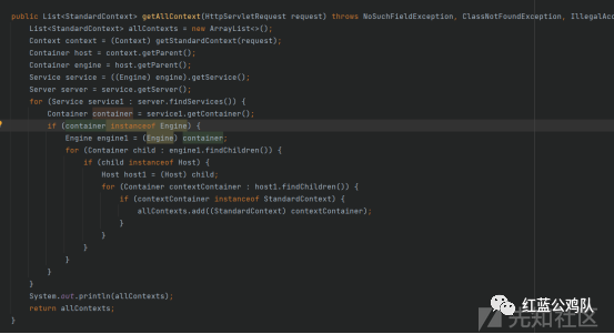 考虑到有些项目有可能是用springboot内嵌的tomcat启动的,我使用了大量的try,catch以及重复的代码去覆盖这种情况。因为springboot内嵌的tomcat重新封装了一些tomcat原本的类,导致很多方法可能需要调用父类(加一个.getSuperclass)去反射才能调用的到。由于时间关系也就没有进行冗余度什么的优化,在编写的过程中也是边探索边写。这里专门列个点就是想提醒大家springboot他自己内嵌的tomcat改了一些东西,想调用起来比较坑,在以后进行漏洞调试的时候也要多多注意,尽量把项目部署在tomcat上进行调试。在注入内存马的时候同样会遇到这种问题,StandardContext获取不到,获取到的是这个类TomcatEmbeddedContext,因为像filterConfigs,filterDefs这类属性都是StandardContext私有的,你使用正常情况下的反射根本获取不到的。
