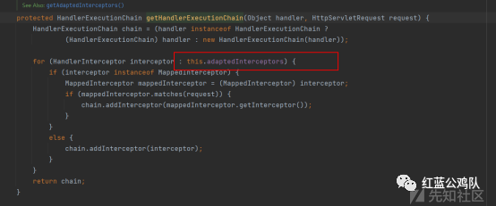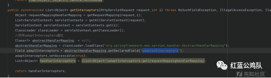 跟进可以看到一个关键变量adaptedInterceptors,所有跟拦截器相关的操作都是根据这个变量来的,那么这里也可以看到,如果我们需要获取拦截器反射获得到adaptedInterceptors就好