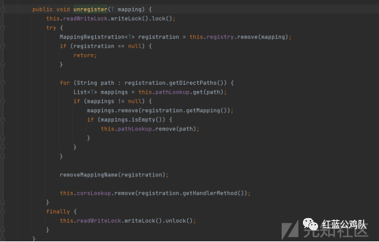 在删除controller内存马我们可以使用相同的道理,即从mappingRegistry中注销指定的controller。比较巧的是在研究了AbstractHandlerMethodMapping类之后,发现其内部正好存在这么一个方法符合需求。该方法从mappingRegistry中移除指定的controller,controller就成功被清除了