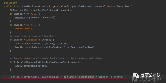 懂了controller其实拦截器也就大同小异了。上面已经提到了,请求会到getHandler这里来