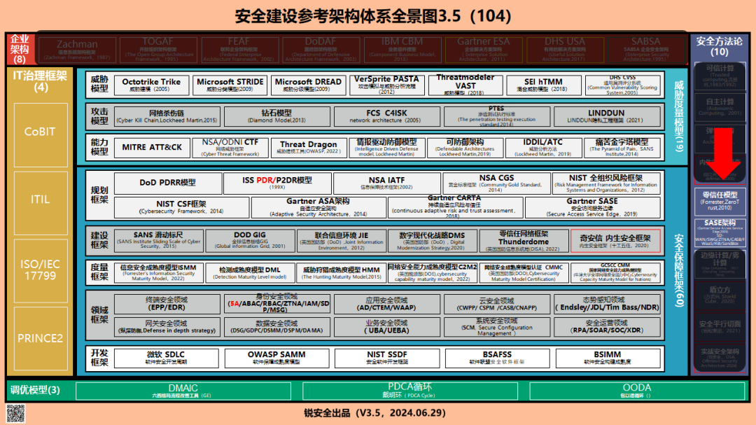 左边是Forrester和DoD定义的零信任的七大“核心能力”,这七大能力支持了中间的“零信任模式”、产生了“关键技术”、最终实现了零信任的“应用场景”。右面的“攻击者视图”是零信任体系面临的挑战,即用零信任依然很难解决的安全问题。
