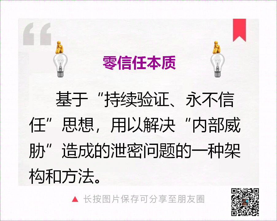 图上最下面一行是零信任的核心思想,最上面一行是零信任的目的,通过这个,就可以得出零信任的一个本质性的定义: