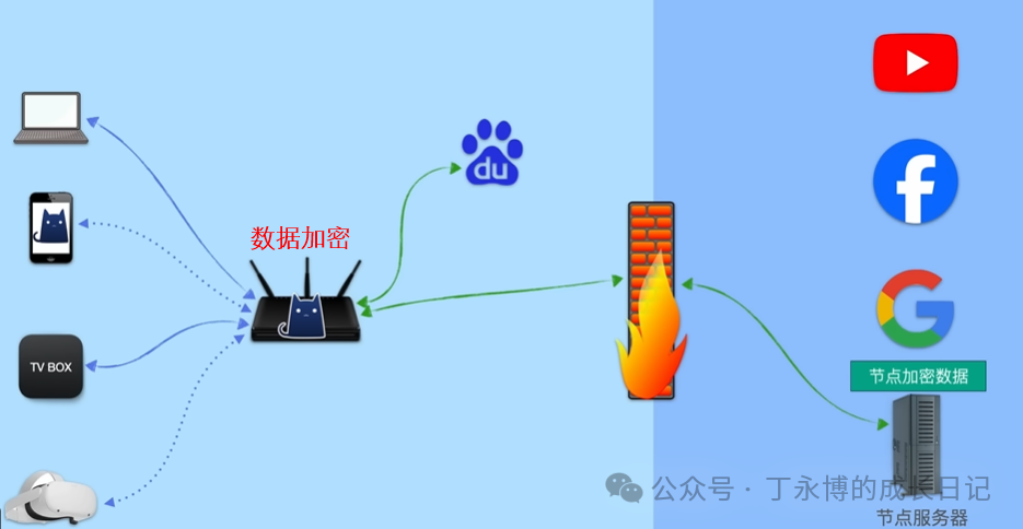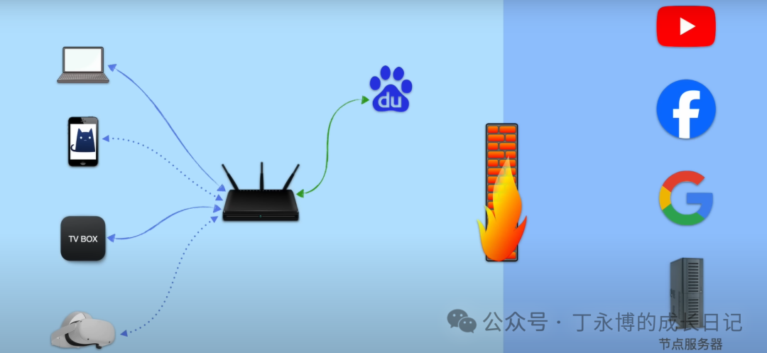 比如我们家用的硬路由,功能都被厂商固话,只能访问国内的网站,比如百度,当他想要访问youtube或其他境外地址时,会被防火墙挡住导致无法访问。
