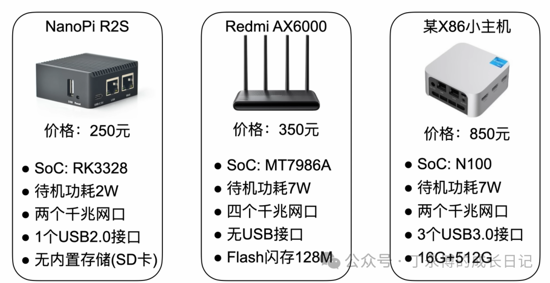 软路由的硬件有以下推荐,如果单纯使用路由系统的话,第一个就可,但是这款属于arm架构,有些软件无法运行,如果还有其他需求,优先建议X86小主机。