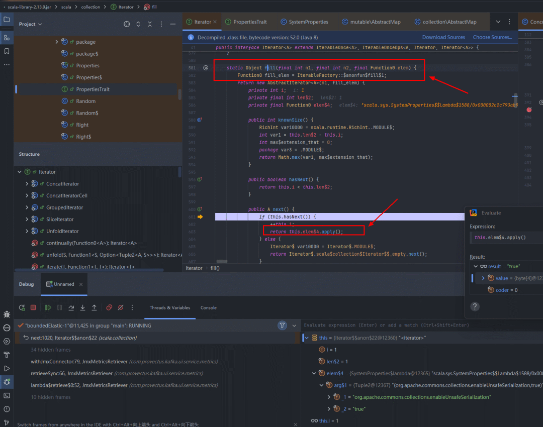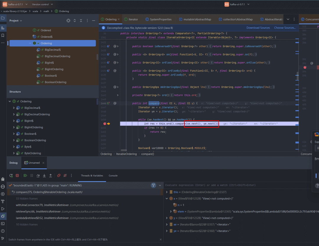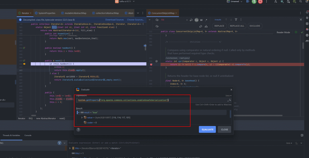 可以在kafka-ui中调试,alt+F8打开Evaluate窗口验证: