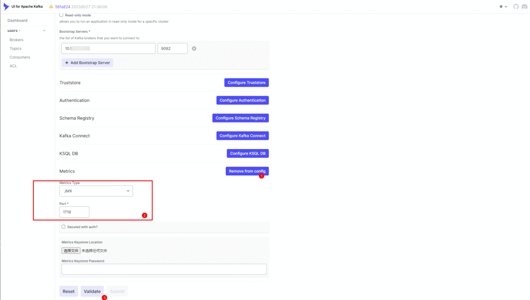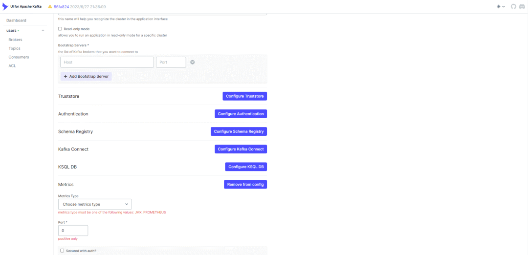 启动成功后直接访问https://localhost:8080/ui/clusters/create-new-cluster,可以创建一个新的Kafka Cluster,里面可以配置Kafka相关的信息,包括Bootstrap Servers地址端口,以及JMX监听端口: