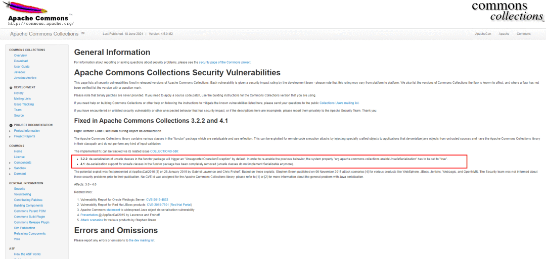 原因可以在Apache Commons官网找到,一则关于Commons Collections反序列化漏洞安全的公告: