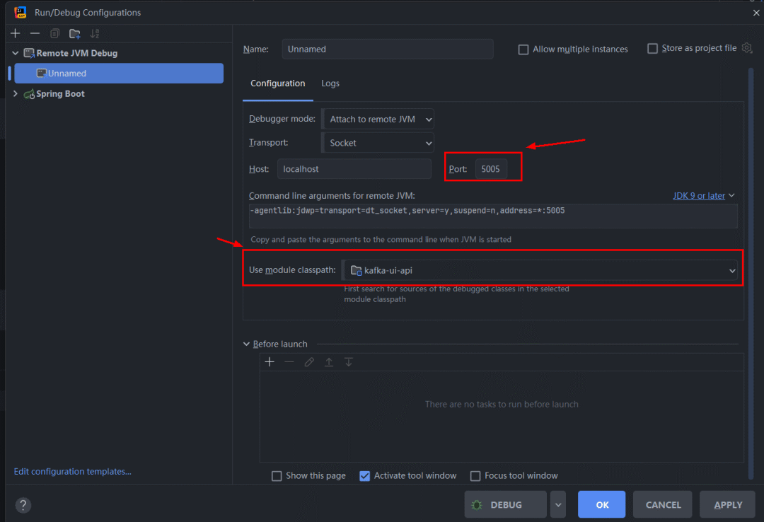 配置如下,注意端口号5005和对应的Spring启动类所在的classpathkafka-ui-api: