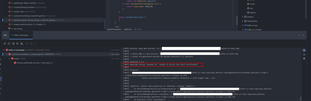 为了方便调试源码,原本打算在本地编译运行,但是由于内网环境,kafka-ui项目编译时使用的pnpm工具需要配置CA证书才能下载对应的依赖进行打包: