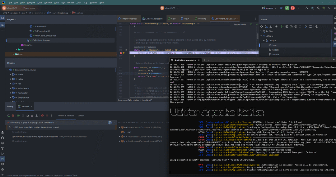 由于kafka-ui运行在jdk17的环境下,所以这里使用java的绝对路径进行启动,顺便加上启用动态配置的参数-Ddynamic.config.enabled=true(漏洞利用的前置条件之一),于是得到了完整的启动命令行: