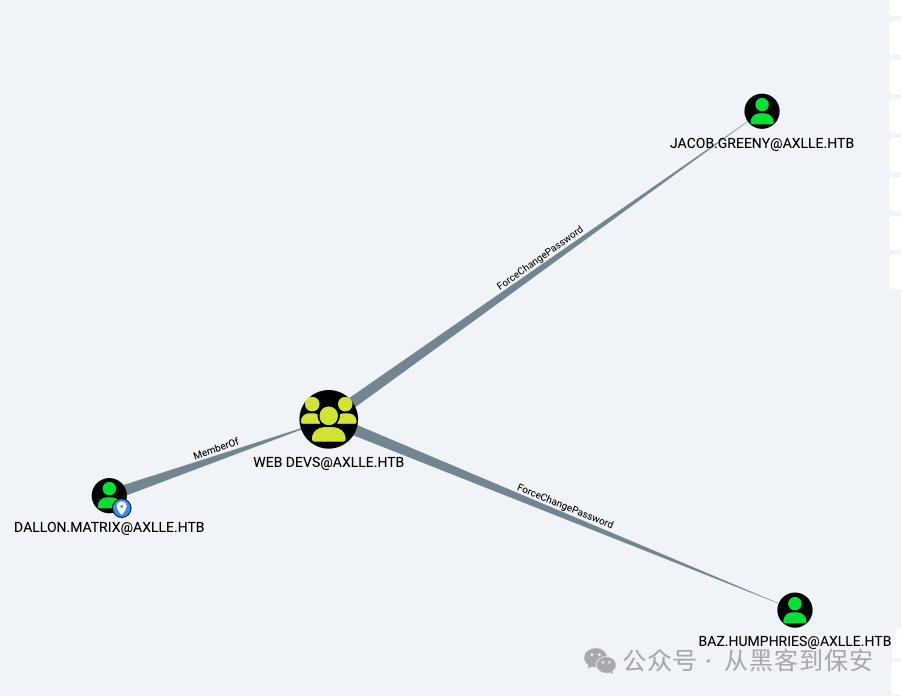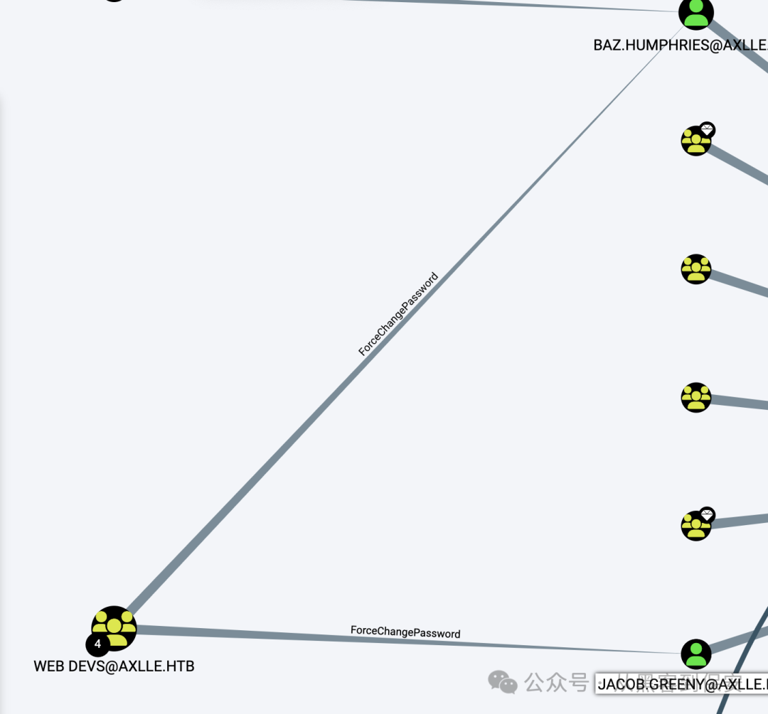 可以发现 web devs@AXXLLE.HTB 组 对用户 JACOB.GREENY 和 BAZ.HUMPHRIES 有 ForceChangePassword权限,可以修改用户 JACOB.GREENY 和 BAZ.HUMPHRIES 的密码
