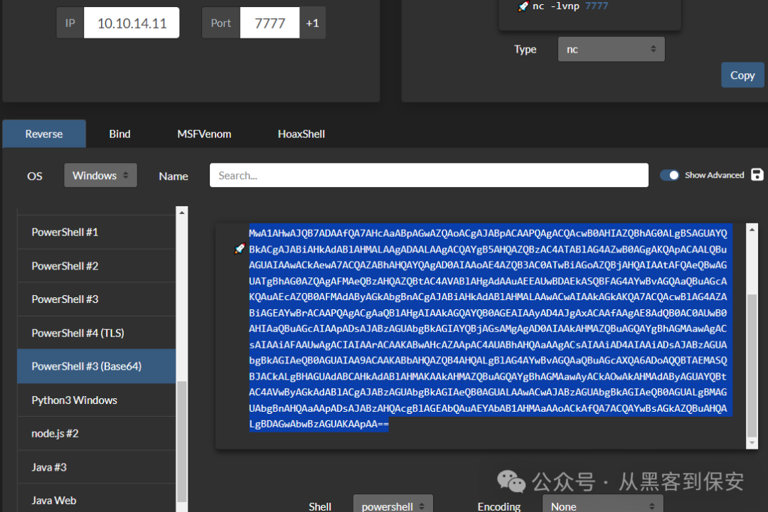 生成反弹shell的shellcode(最终尝试用powershell版本成功):