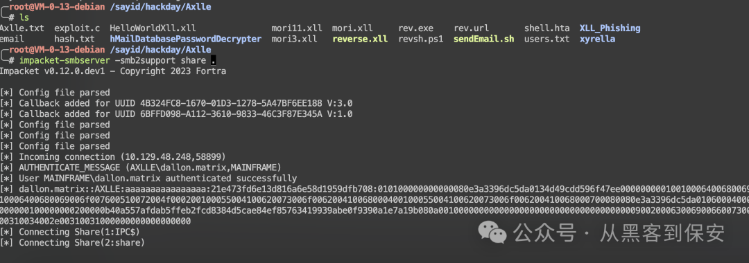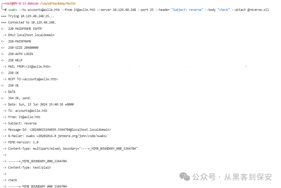通过 swaks 命令,将生成的reverse.xll 以附件形式发送邮件 到 accounts@axlle.htb