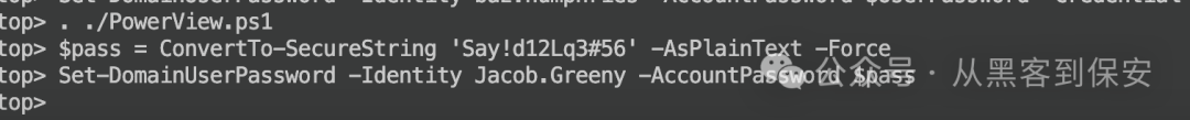 Set-DomainUserPassword -Identity Jacob.Greeny -AccountPassword $pass